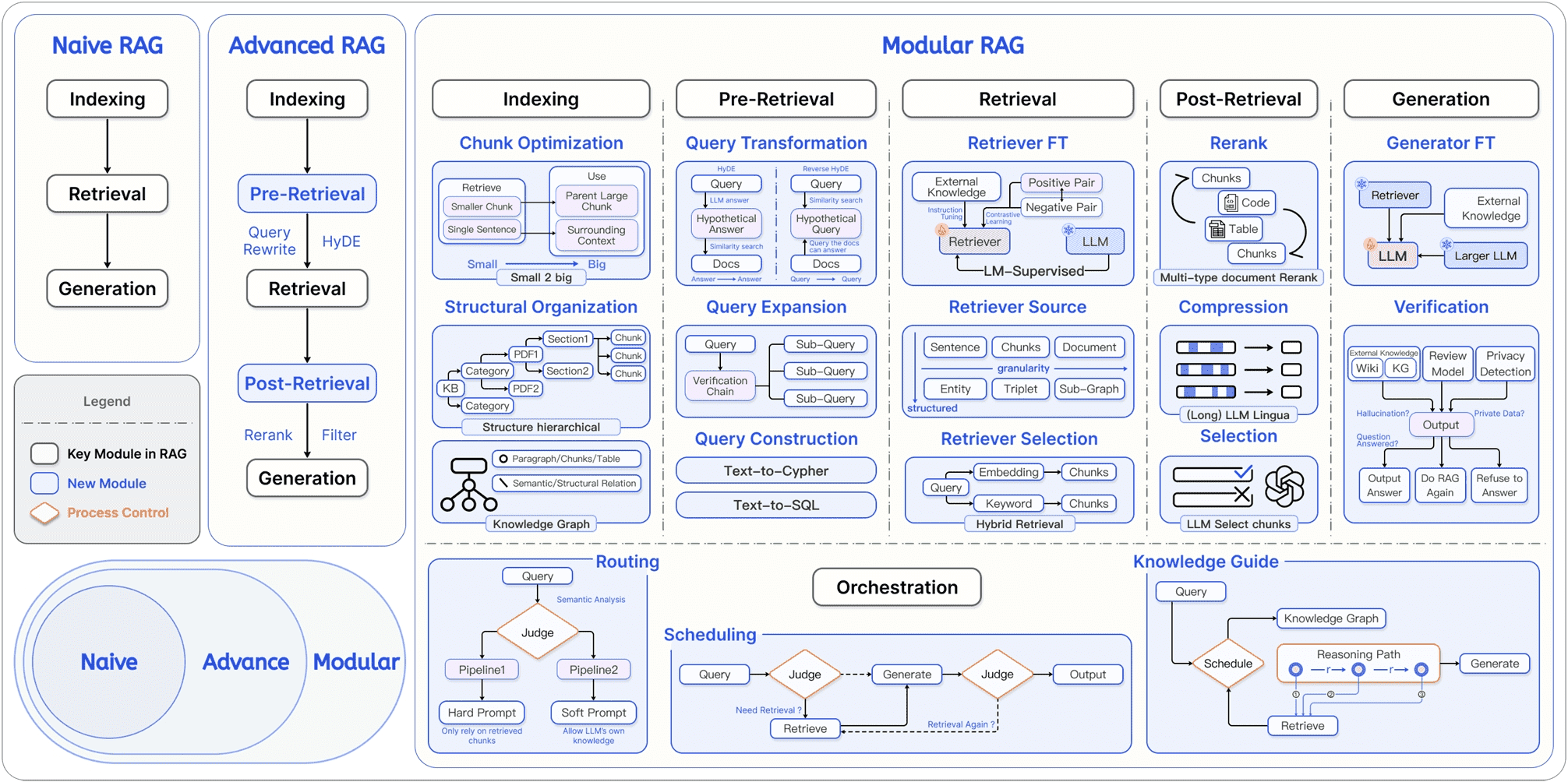 RAG 的技术架构经历了从简单到复杂的演进,如下图大致可分为三个阶段