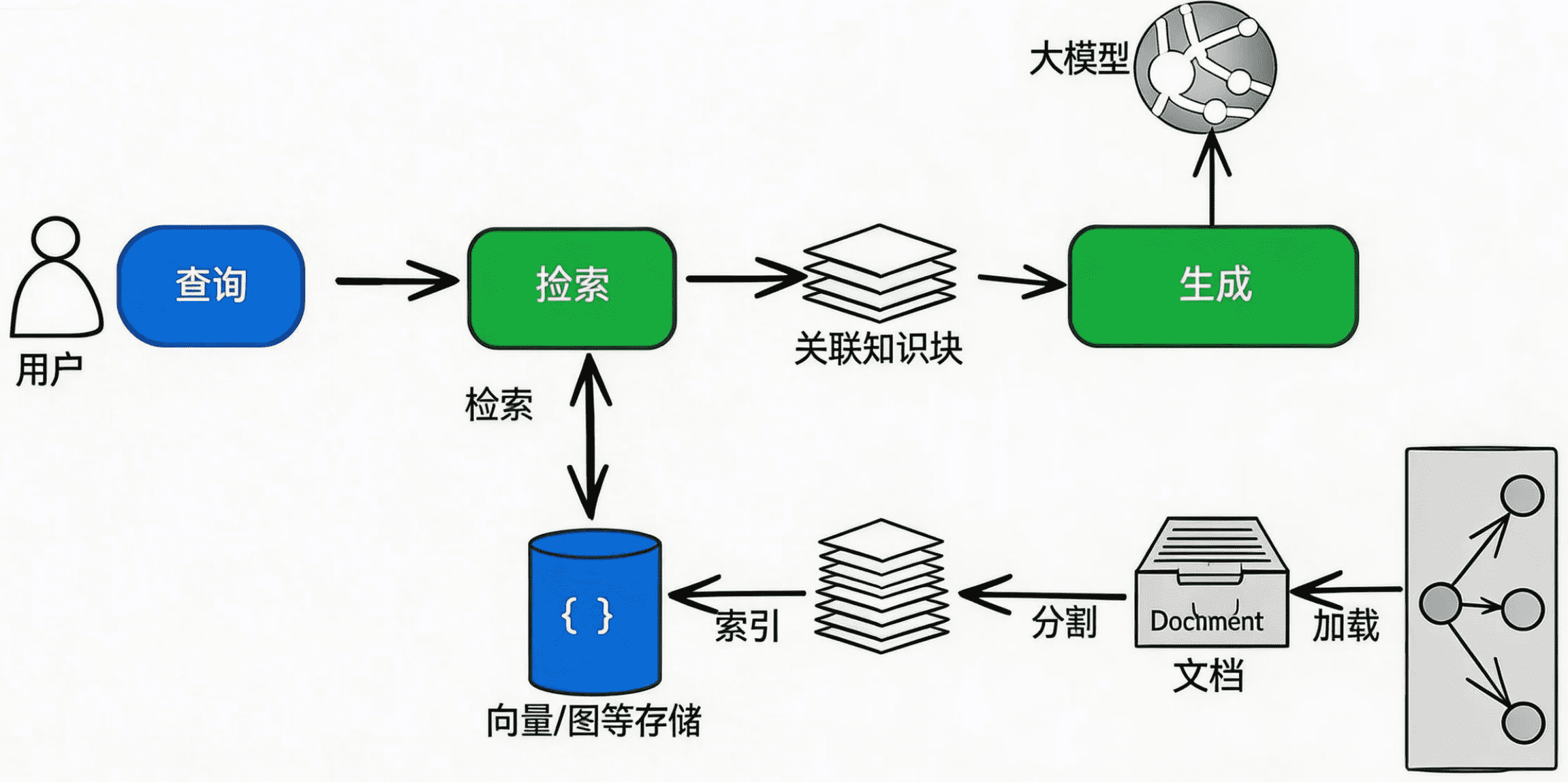 - 检索(Retrieval):检索依托向量存储等索引,从库中取出相关知识块并按相关性排序,为后续生成提供参考上下文