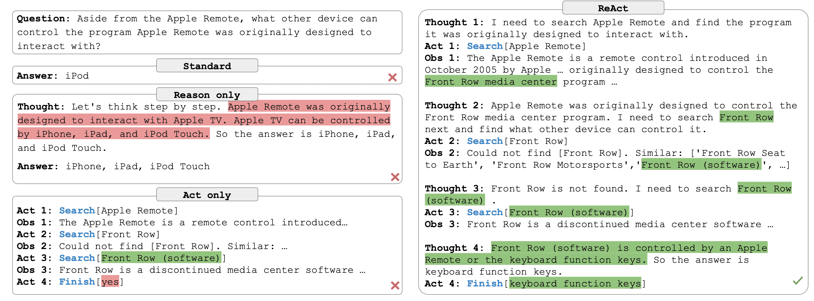 Act 4: Finish[keyboard function keys] - 结果:答案正确,且整个思考 - 行动 - 观察的过程透明可追溯。