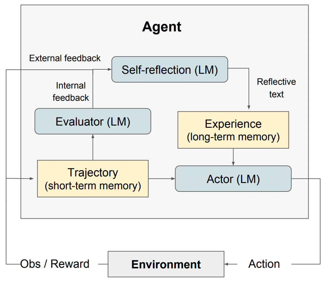 推理时 Actor 同时看 “最近细节”+“过往踩坑经验”,模仿人类:既记得当下步骤,又记得长期教训。这是 Reflexion 相比普通 LLM 行动智能体的关键优势。