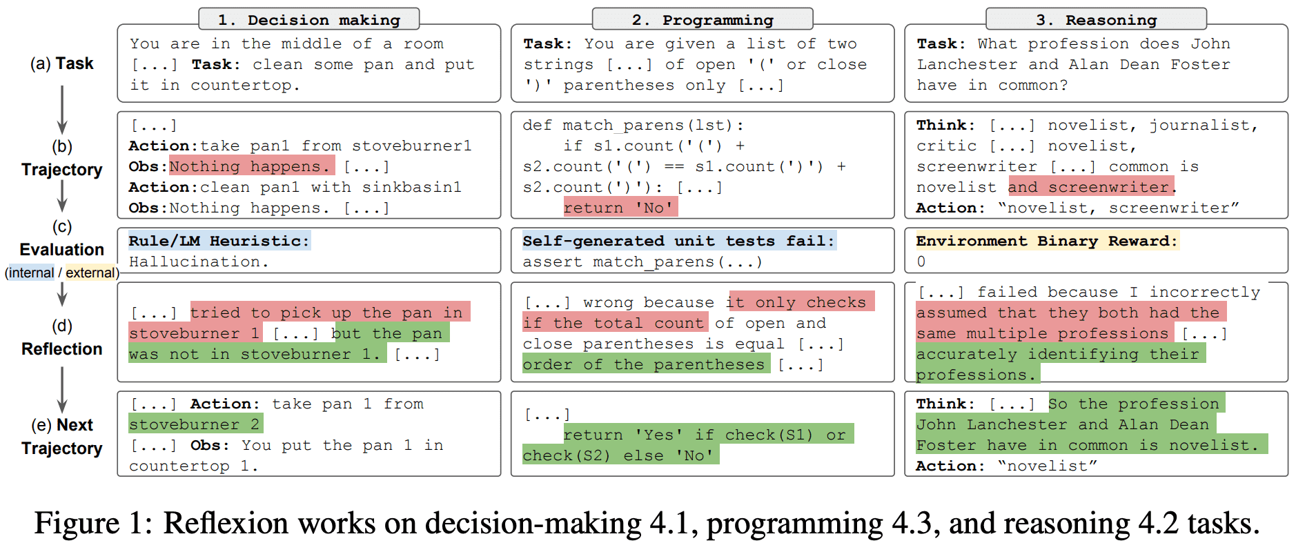 (d) Reflection:Self-Reflection 模型分析错误原因,生成自然语言改进建议